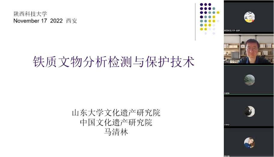 11月17日,應(yīng)我校科技處、文物保護(hù)科學(xué)與技術(shù)學(xué)院邀請(qǐng),山東大學(xué)馬清林教授做客我?!扒把乜茖W(xué)報(bào)告”,作了題為“鐵質(zhì)文物分析檢測(cè)與保護(hù)技術(shù)”的線上學(xué)術(shù)報(bào)告。報(bào)告由文物保護(hù)科學(xué)與技術(shù)學(xué)院院長(zhǎng)朱建鋒教授主持,學(xué)院相關(guān)領(lǐng)域教師和研究生參加了此次報(bào)告會(huì)。