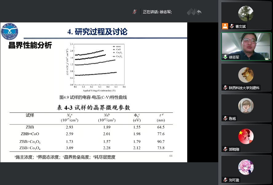 報(bào)告中,徐志軍教授從ZnO基壓敏陶瓷的基本概念、研究背景和研究現(xiàn)狀出發(fā),詳細(xì)分析了其缺陷特征和導(dǎo)電機(jī)理。在此基礎(chǔ)上,以制備純銀內(nèi)電極多層片式ZnO基壓敏陶瓷器件為研究目標(biāo),重點(diǎn)介紹了報(bào)告人所在課題組近幾年在低溫?zé)Y(jié)低壓高性能ZnO基壓敏陶瓷方面所做的工作。通過(guò)添加燒結(jié)助劑來(lái)降低壓敏陶瓷的燒結(jié)溫度,但燒結(jié)溫度降低的同時(shí),由于摻雜劑與ZnO之間會(huì)發(fā)生化學(xué)反應(yīng),導(dǎo)致晶界氧空位含量較低,從而影響了晶界吸附氧的傳輸,不利于晶界雙肖特基勢(shì)壘的提高及非線性電學(xué)性能的優(yōu)化?;诖?,課題組進(jìn)行了預(yù)合成富鉍相摻雜,實(shí)驗(yàn)表明,這在加快液相傳質(zhì),促進(jìn)缺陷反應(yīng),減少氧空位消耗,提高晶界勢(shì)壘,改善ZnO基壓敏陶瓷的非線性系數(shù)等電學(xué)性能方面效果明顯。