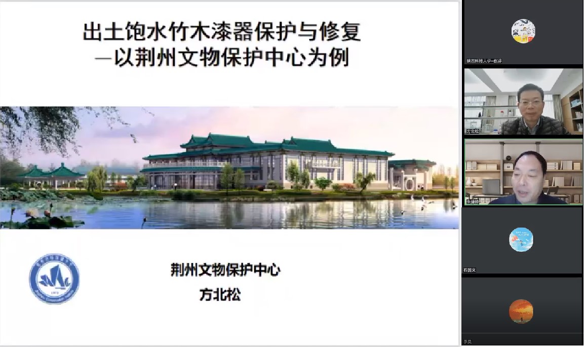 方北松研究館員從竹木漆器基本種類、竹木漆器的保護(hù)、漆器復(fù)原研究及竹木漆器保護(hù)最新研究四個(gè)方面,專業(yè)且系統(tǒng)地講解了飽水漆木器的出土——修復(fù)——完善全過程所使用的理念、方法及材料,帶領(lǐng)與會(huì)師生感受千年古人的藝術(shù)造詣與現(xiàn)代文物修復(fù)的不斷進(jìn)步與發(fā)展。