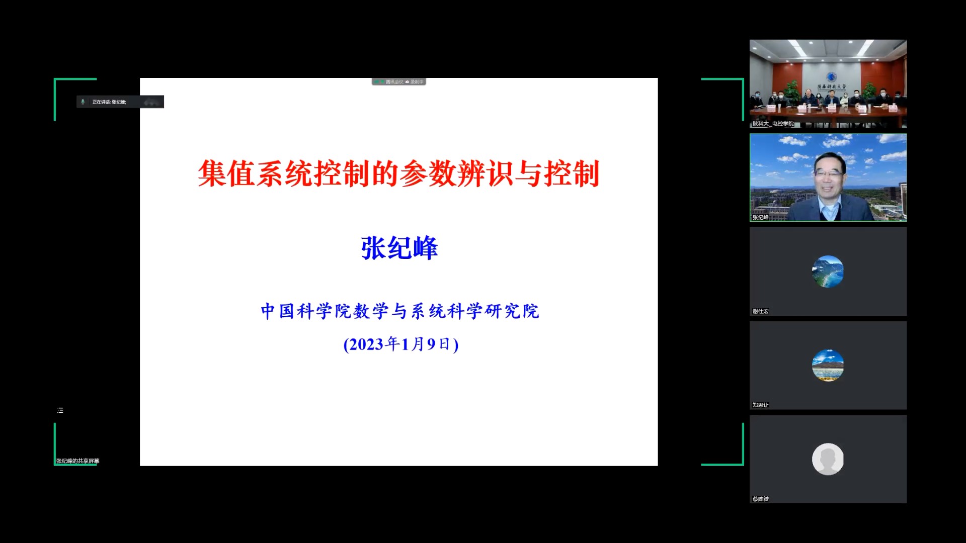 近日,受電氣與控制工程學(xué)院邀請,中國科學(xué)院數(shù)學(xué)與系統(tǒng)科學(xué)研究院研究員張紀(jì)峰教授做客我校“前沿科學(xué)報(bào)告”,作了題為“集值系統(tǒng)控制的參數(shù)辨識(shí)與控制”的線上學(xué)術(shù)報(bào)告。黃劍鋒副校長、電控學(xué)院黨委書記喬明哲、院長湯偉、學(xué)術(shù)骨干和部分教師代表在逸夫樓406會(huì)議室出席了此次會(huì)議,全校師生210余人線上參會(huì),會(huì)議由電控學(xué)院院長湯偉主持。
