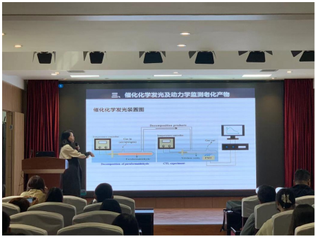 田銳副教授立足對聚合物降解過程的可視化難題,從官能團(tuán)熒光可視化、自由基熒光可視化、產(chǎn)物催化化學(xué)發(fā)光等三方面介紹了團(tuán)隊(duì)的最新進(jìn)展,詳細(xì)闡述了催化化學(xué)發(fā)光在聚合物降解中的動(dòng)力學(xué)檢測。