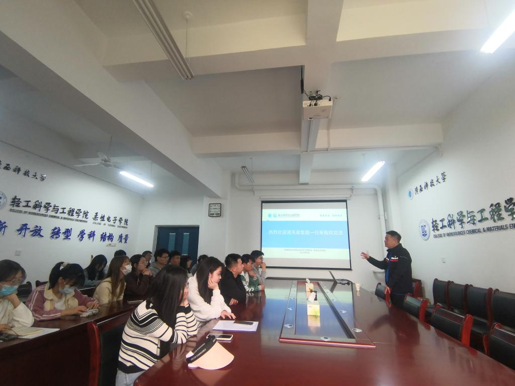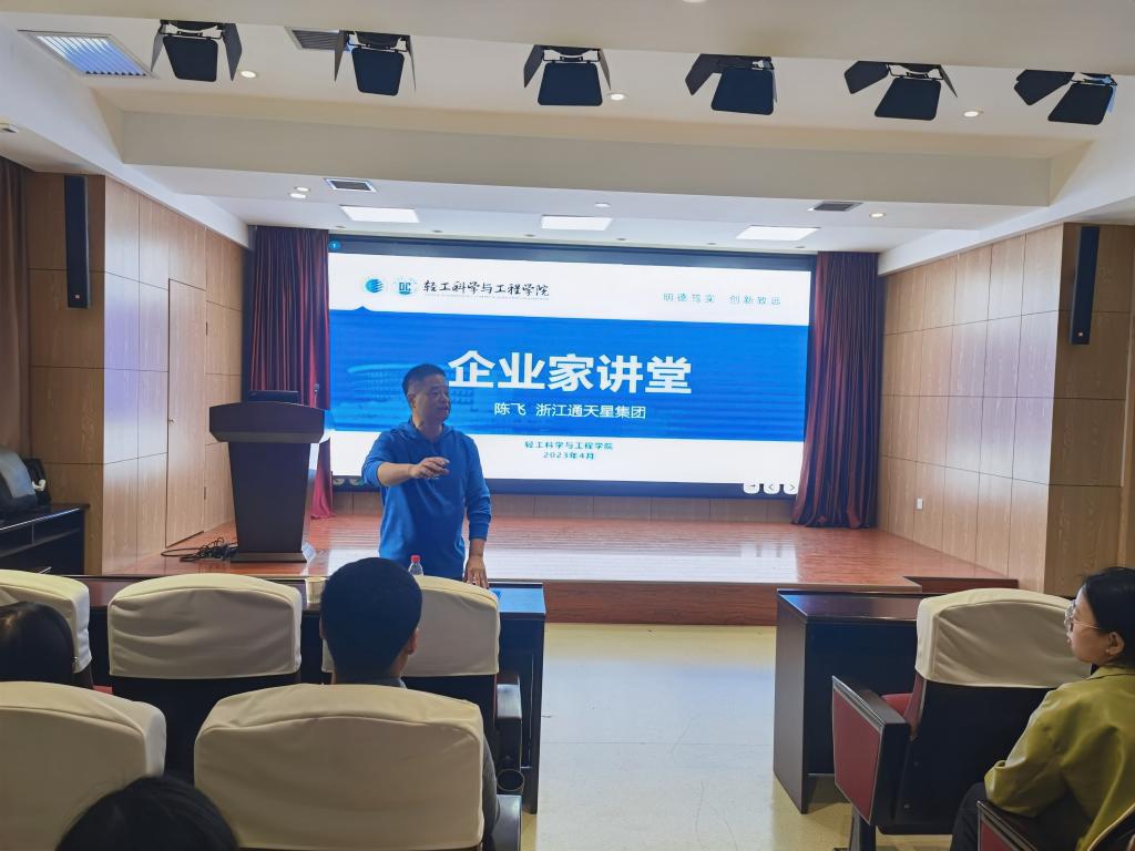 4月11日,應輕工科學與工程學院(柔性電子學院)邀請,浙江通天星集團股份有限公司陳飛董事長做客我?!拔囱雽熣搲?,作了題為“皮革前沿科技的發(fā)展與人才需求”的專題報告。報告會由輕工學院黨委副書記張乾隆主持,學院輕化工程部分師生參加了此次報告會。