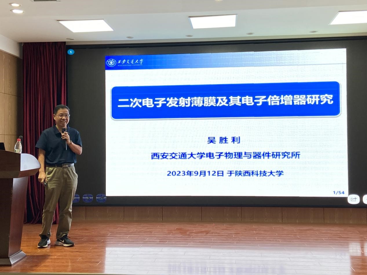 9月12日上午,應(yīng)我校輕工科學(xué)與工程(柔性電子)學(xué)院、科技處及前沿院邀請(qǐng),西安交通大學(xué)電子物理與器件研究所吳勝利教授做客我?!扒把乜茖W(xué)報(bào)告”,作了題為“二次電子發(fā)射薄膜與其電子倍增器研究”的學(xué)術(shù)報(bào)告。報(bào)告會(huì)由輕工學(xué)院院長(zhǎng)助理游翔宇主持,學(xué)院相關(guān)專業(yè)教師、研究生參加了此次報(bào)告會(huì)。