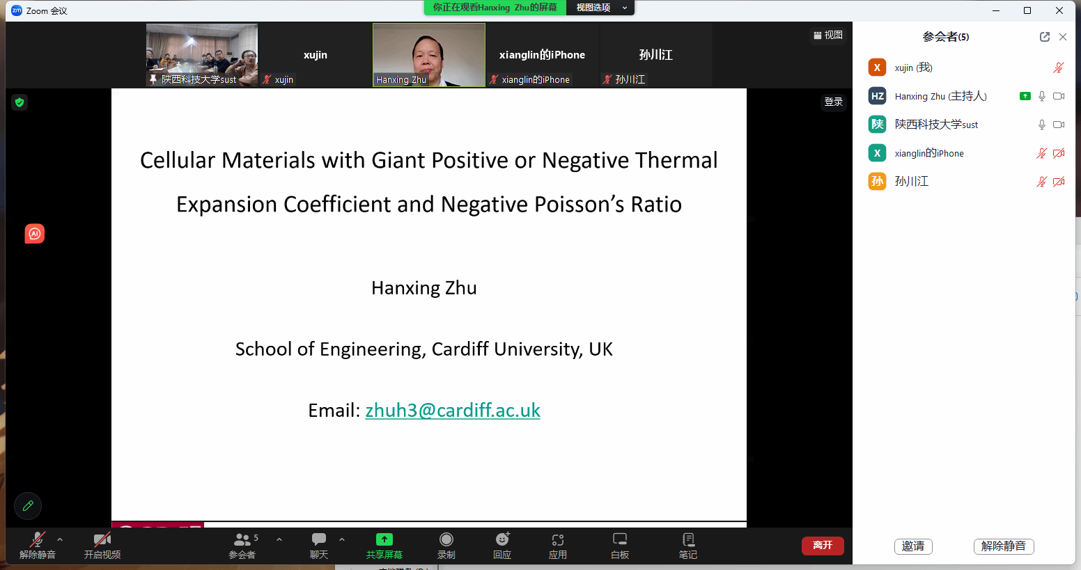 11月27日,應(yīng)科技處與機(jī)電工程學(xué)院(智能制造與機(jī)器人工程學(xué)院)邀請,英國卡迪夫大學(xué)朱漢興教授做客我?!扒把乜茖W(xué)報告”,作了題為“Cellular Materials with Giant Positive or Negative Thermal Expansion Coefficient and Negative Poisson’s Ration”的學(xué)術(shù)報告。報告會由機(jī)電學(xué)院李晨教授主持,機(jī)電學(xué)院副院長楊立軍教授、微納機(jī)電研究所老師和部分研究生參加報告。