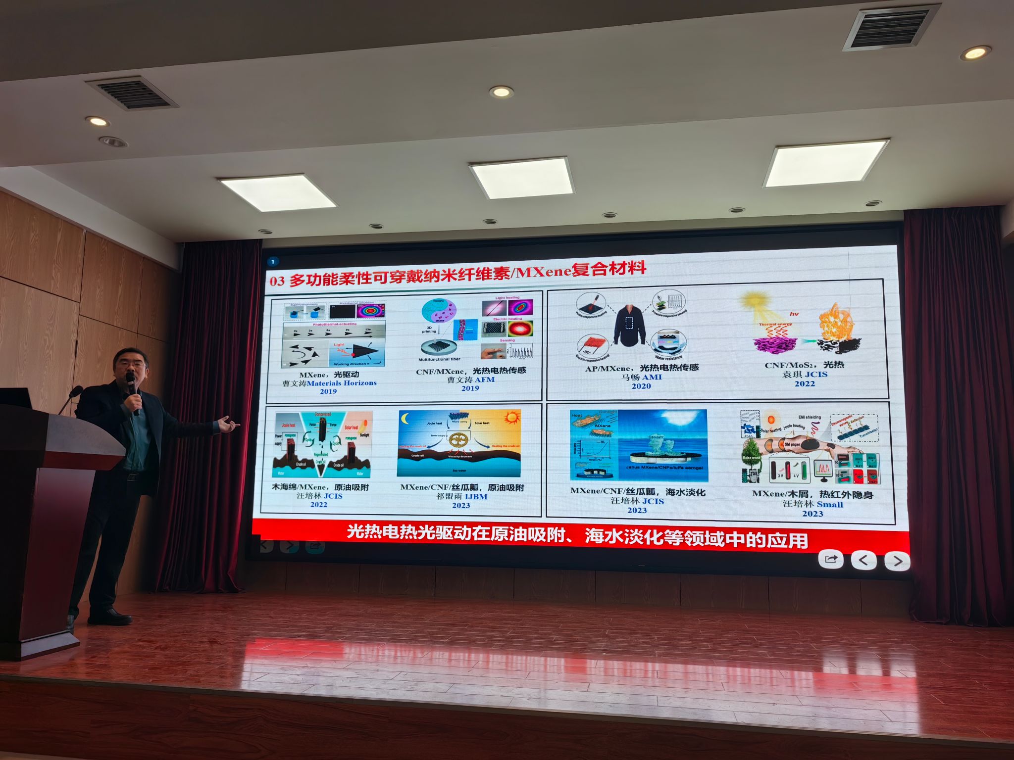 報(bào)告會(huì)上,馬明國(guó)教授針對(duì)柔性智能纖維織物存在的科學(xué)問題,采用綠色便捷的真空抽濾和3D打印策略,合成了膜、光驅(qū)動(dòng)紙、摩擦納米發(fā)電機(jī)以及智能纖維織物等一系列多功能復(fù)合材料,為生物質(zhì)資源化、功能化以及高值化提供了新方法,為設(shè)計(jì)多功能高性能的復(fù)合材料并拓展其應(yīng)用領(lǐng)域提供了技術(shù)支持及理論支撐。
