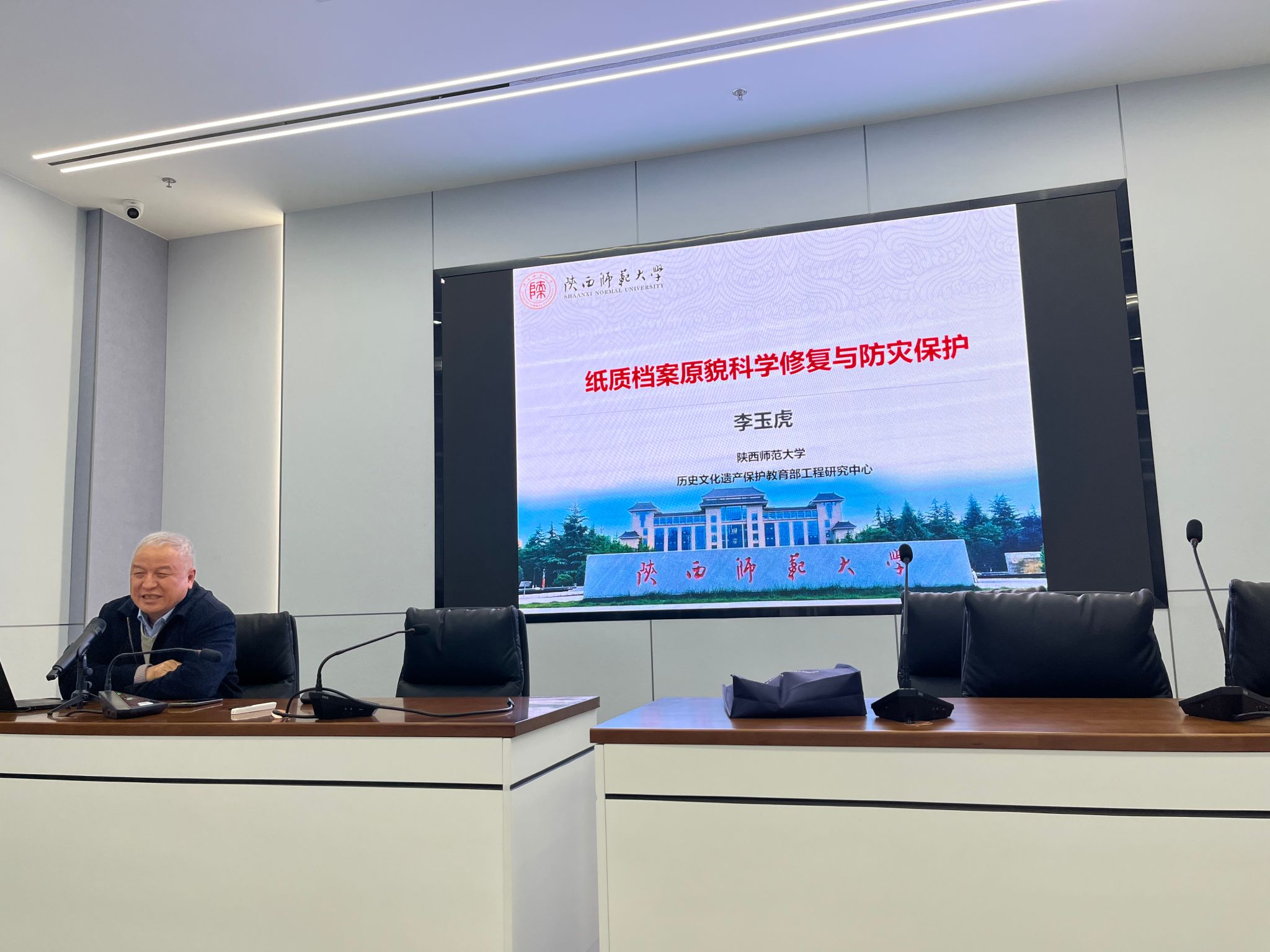 李玉虎教授以科技創(chuàng)新驅動守護中華文脈為引子,強調了紙質文物保護的重要性與緊迫性。詳細講解了紙質檔案原貌科學修復與防災保護技術、整卷檔案、整本圖書氣相脫酸與加固關鍵技術,最后介紹了環(huán)保型防災耐久抗疫檔案盒與封存箱的研發(fā)歷程。