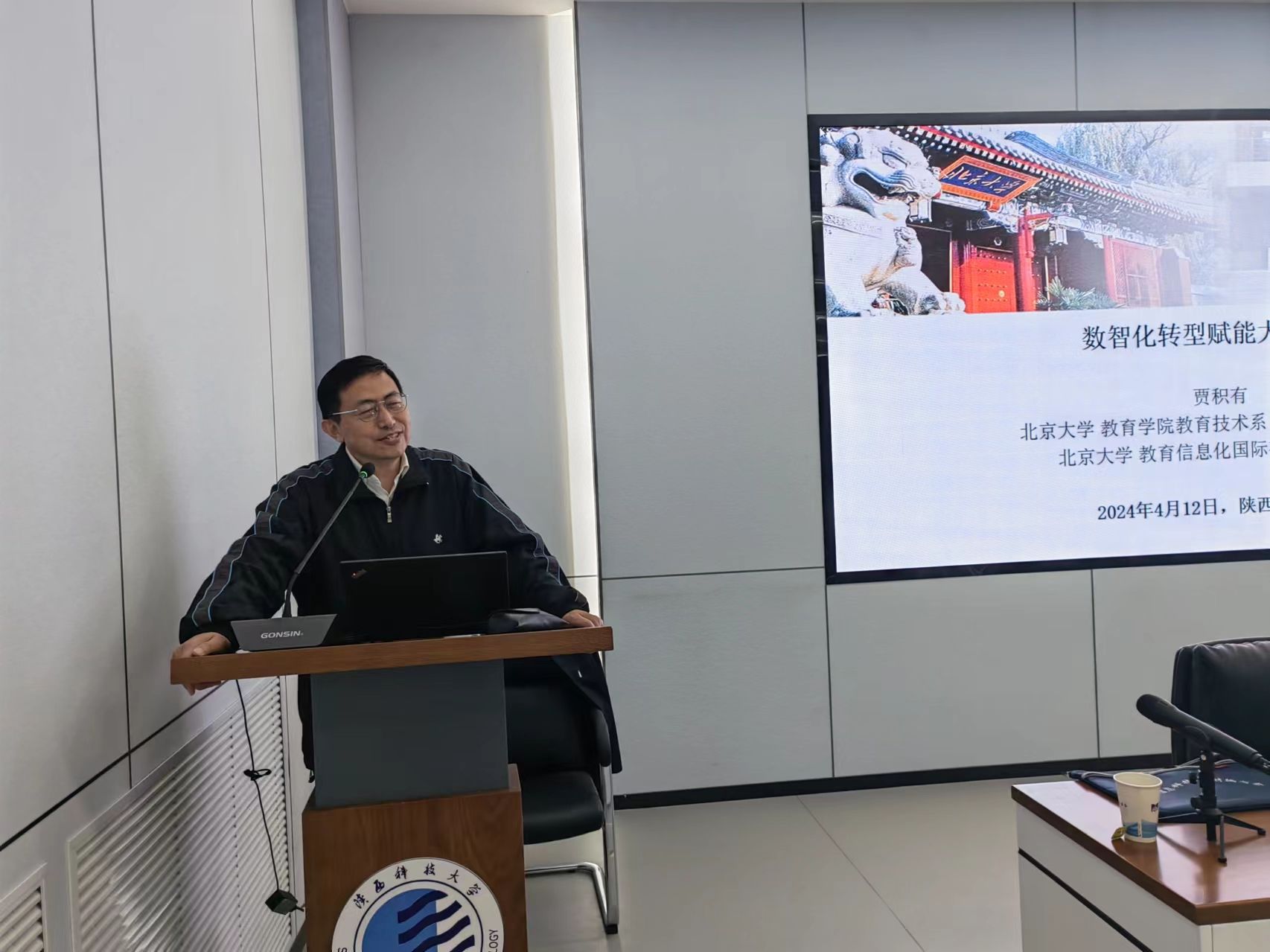 4月12日,教師發(fā)展中心邀請北京大學(xué)教育學(xué)院博士生導(dǎo)師賈積有教授做客我?!懊麕熣搲?,作了題為《數(shù)智化轉(zhuǎn)型賦能大學(xué)教學(xué)》的學(xué)術(shù)講座,我校70余名教師聆聽了報告。文化與教育學(xué)院楊曉教授主持本次報告會。