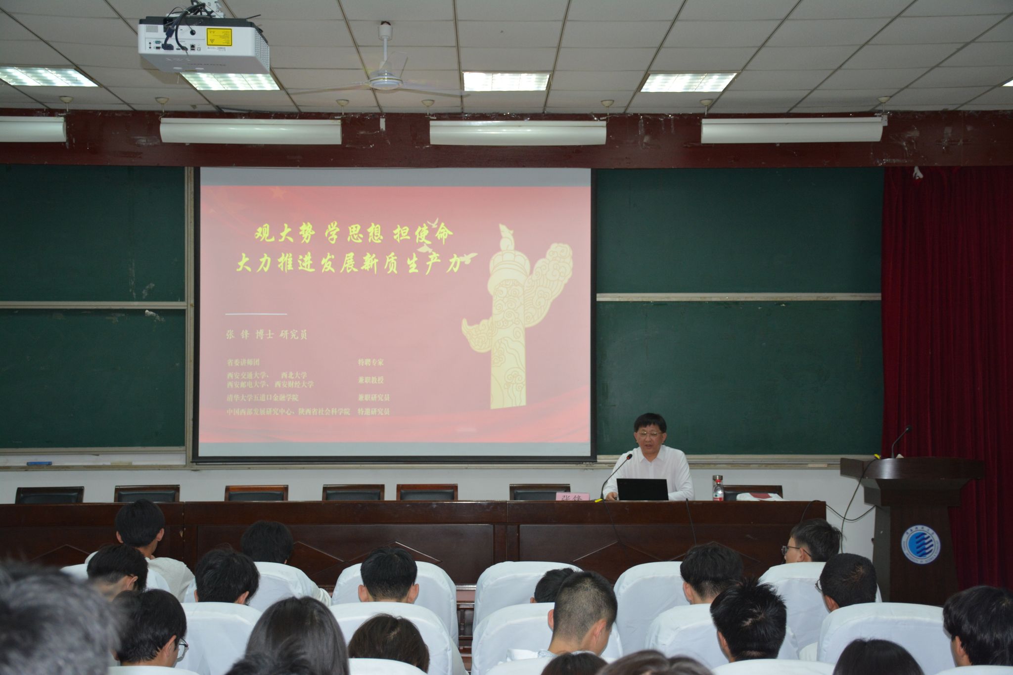 5月10日,應我校馬克思主義學院邀請,陜西省委理論講師團特聘專家張鋒研究員做客“至博大講堂”,為廣大師生帶來一場題為“觀大勢 學思想 擔使命 大力推進發(fā)展新質(zhì)生產(chǎn)力”的精彩報告。報告由馬院院長吳明永主持,思政課教師代表、馬克思主義理論碩士研究生以及部分本科生參加報告會。