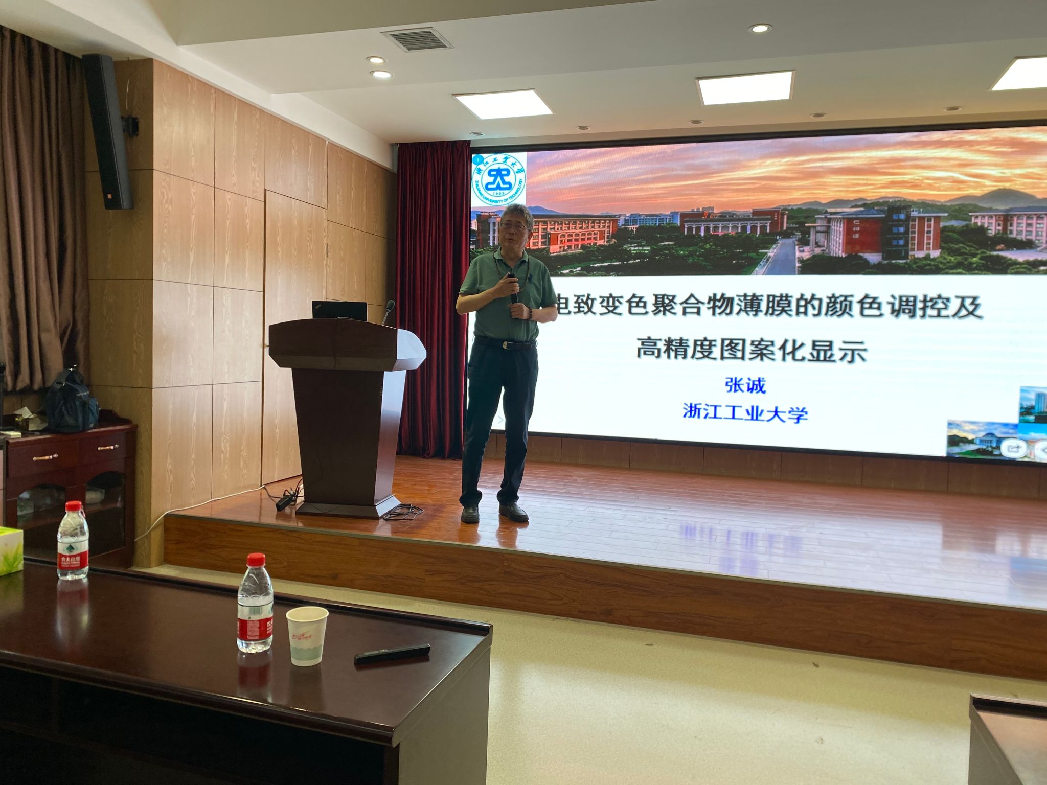 5月20日,浙江工業(yè)大學(xué)張誠(chéng)教授應(yīng)我校輕工科學(xué)與工程學(xué)院(柔性電子學(xué)院)、科技處及前沿院邀請(qǐng),做客我?!扒把乜茖W(xué)報(bào)告”,作了題為“電致變色聚合物薄膜的顏色調(diào)控及高精度圖案化顯示”的學(xué)術(shù)報(bào)告。報(bào)告會(huì)由輕工學(xué)院院長(zhǎng)呂斌教授主持,學(xué)院相關(guān)專(zhuān)業(yè)教師、研究生及本科生參加了此次報(bào)告會(huì)。