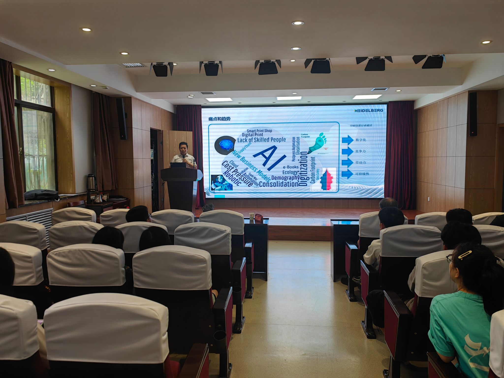 報(bào)告會上,王勇首先介紹了印刷包裝行業(yè)的發(fā)展趨勢,分析了當(dāng)前印刷包裝產(chǎn)業(yè)用到的新技術(shù)新產(chǎn)品,并介紹了其內(nèi)涵、特征以及開發(fā)的思路。隨后,他以速霸2020時(shí)代膠印機(jī)為例,介紹了人工智能在企業(yè)發(fā)展中的巨大潛力,將智能化等新技術(shù)引入大規(guī)模生產(chǎn)線,有效提高了產(chǎn)業(yè)綜合效率,降低了產(chǎn)品成本,通過智能化和自動化的引進(jìn),給用戶提供了現(xiàn)代化且具有吸引力的工作環(huán)境,以最大優(yōu)勢激勵技術(shù)人才。最后,他還詳細(xì)介紹了智能化工廠管理在印后加工工藝上的應(yīng)用,并鼓勵學(xué)生善于思考,勇于實(shí)踐,培養(yǎng)創(chuàng)新思維,更好地適應(yīng)和應(yīng)對未來的挑戰(zhàn)與機(jī)遇。