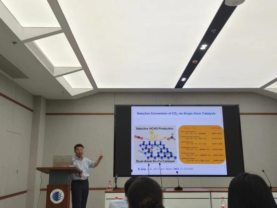 報(bào)告會(huì)上,Wonyong Choi教授首先說明了太陽(yáng)能及光(電)催化在實(shí)現(xiàn)自然界各種化學(xué)元素(如C、N、O和H)可持續(xù)循環(huán)中扮演著重要角色;其次,Wonyong Choi教授圍繞C、N和O等小分子化合物的光催化/光電化學(xué)(PEC)轉(zhuǎn)化,介紹了各種工程化光(電)催化系統(tǒng),其可實(shí)現(xiàn)NO3?、NO2?、NO、NH4?和 N2的選擇性轉(zhuǎn)化;隨后,詳細(xì)描述了通過O2還原可持續(xù)生產(chǎn)H2O2的光催化/光電化學(xué)系統(tǒng),其在無偏壓條件下能夠連續(xù)生產(chǎn)H2O2超過100小時(shí);最后,Wonyong Choi教授舉例說明了使用異核雙原子位點(diǎn)催化劑控制CO2轉(zhuǎn)化的多電子轉(zhuǎn)移機(jī)制。