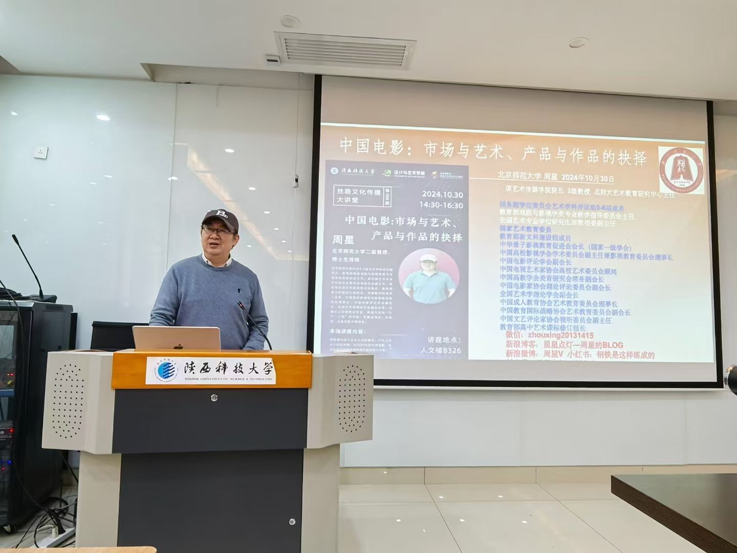 10月30日下午,應(yīng)我校設(shè)計與藝術(shù)學(xué)院、科技處及前沿院邀請,北京師范大學(xué)周星教授做客我?!扒把乜茖W(xué)報告”,作了題為“中國電影:市場與藝術(shù)、產(chǎn)品與作品的抉擇”的學(xué)術(shù)報告。報告會由設(shè)藝學(xué)院副院長吉平主持,設(shè)藝學(xué)院黨委書記劉和林及相關(guān)專業(yè)師生參加了此次報告會。