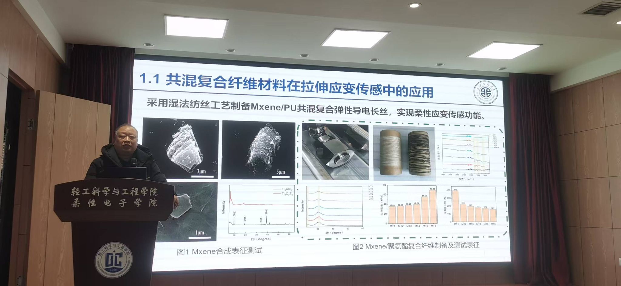 孫潤(rùn)軍教授闡述了多功能纖維材料的應(yīng)用背景,從共混復(fù)合材料在應(yīng)變/應(yīng)力傳感檢測(cè)中的應(yīng)用、間隔織物/陶瓷纖維氈在高溫隔熱中的應(yīng)用、抗菌粘附貼劑用雙層復(fù)合微納米纖維材料、高分子水凝膠/高性能織物防刺復(fù)合材料以及柔性復(fù)合材料在隱身領(lǐng)域的應(yīng)用研究五個(gè)方面進(jìn)行了詳細(xì)講解。此外,孫潤(rùn)軍教授指出應(yīng)聚焦功能智能紡織材料及制品,面向國(guó)防軍工、產(chǎn)業(yè)行業(yè)的實(shí)際問(wèn)題,需大力研究開(kāi)發(fā)極端環(huán)境條件下的功能紡織材料,著重圍繞廢舊紡織材料開(kāi)展研究工作,實(shí)現(xiàn)紡織材料的閉環(huán)循環(huán)利用。