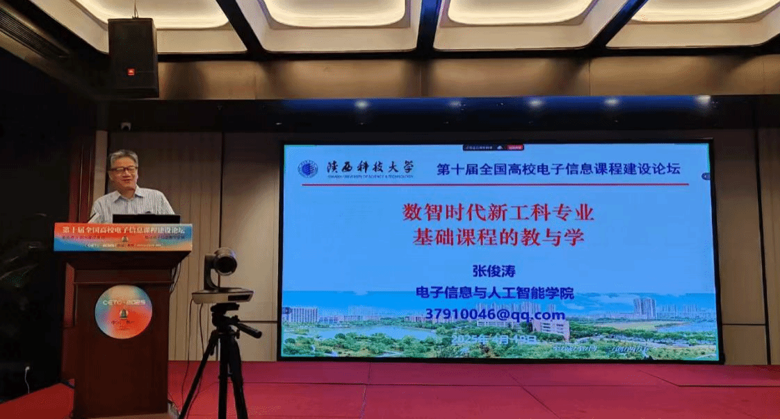 4月19日,第10屆全國高校電子信息課程建設(shè)論壇在杭州召開,我校電子信息與人工智能學(xué)院張俊濤教授受邀在論壇上以“數(shù)智時代新工程專業(yè)基礎(chǔ)課程的教與學(xué)”為主題做了專題報告,報告引起參會教師的共鳴,受到一致好評。