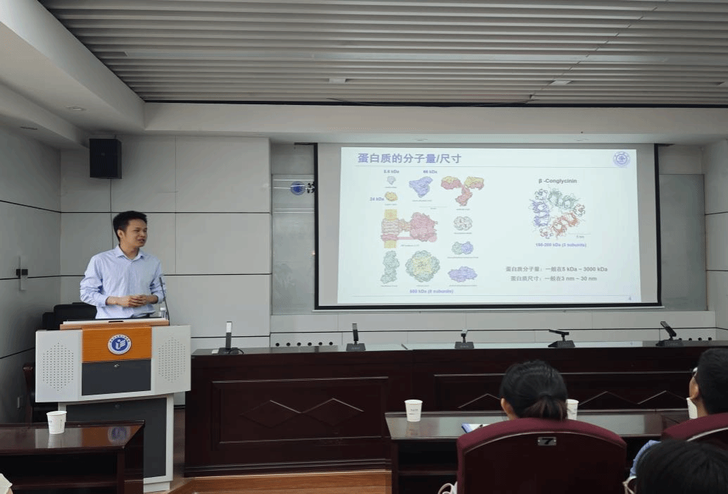 操義平教授以植物源食品蛋白質(zhì)的纖維化研究為例,從蛋白質(zhì)結(jié)構(gòu)解析與功能應(yīng)用兩方面為參會師生進行了詳細(xì)介紹。他講解了大豆11S蛋白、花生蛋白、棉籽蛋白等植物蛋白的纖維化機制,指出通過調(diào)控溫度與時間可實現(xiàn)纖維結(jié)構(gòu)的定向設(shè)計。基于中國血紅蛋白年儲量超157萬噸、全球超594萬噸的數(shù)據(jù),他強調(diào)開發(fā)新型蛋白資源對滿足人口蛋白需求的戰(zhàn)略意義,并在植物蛋白資源高效利用方面提出指導(dǎo)性的建議。