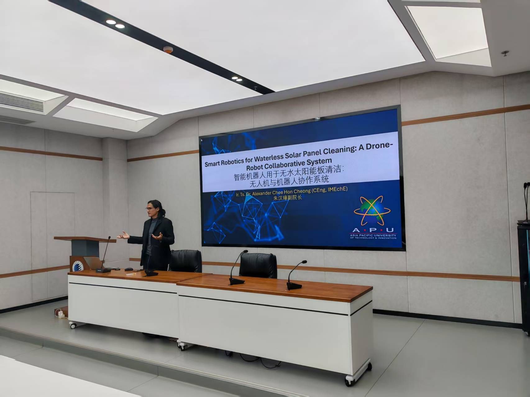 報(bào)告會(huì)上,Alexander Chee Hon Cheong教授首先介紹了太陽(yáng)能電池板在馬來(lái)西亞的應(yīng)用前景及太陽(yáng)能電池板在無(wú)水環(huán)境下的清潔需求,隨后分享了亞太科技大學(xué)工程學(xué)院在智能機(jī)器人用于無(wú)水太陽(yáng)能電池板清潔的研究進(jìn)展。探討了無(wú)人機(jī)與機(jī)器人協(xié)作系統(tǒng)的建立,數(shù)學(xué)仿真方法,同時(shí)就當(dāng)前無(wú)人機(jī)應(yīng)用于新能源領(lǐng)域存在的問(wèn)題進(jìn)行了分析,結(jié)合馬來(lái)西亞當(dāng)?shù)貧夂蛱卣?,分享了?shí)際應(yīng)用案例。Alexander Chee Hon Cheong教授與參會(huì)師生進(jìn)行了深入的交流,討論了智能機(jī)器人在各工業(yè)領(lǐng)域的應(yīng)用前景及存在的關(guān)鍵問(wèn)題。通過(guò)此次學(xué)術(shù)報(bào)告有助于提升我校在機(jī)器人領(lǐng)域的國(guó)際化交流和合作。