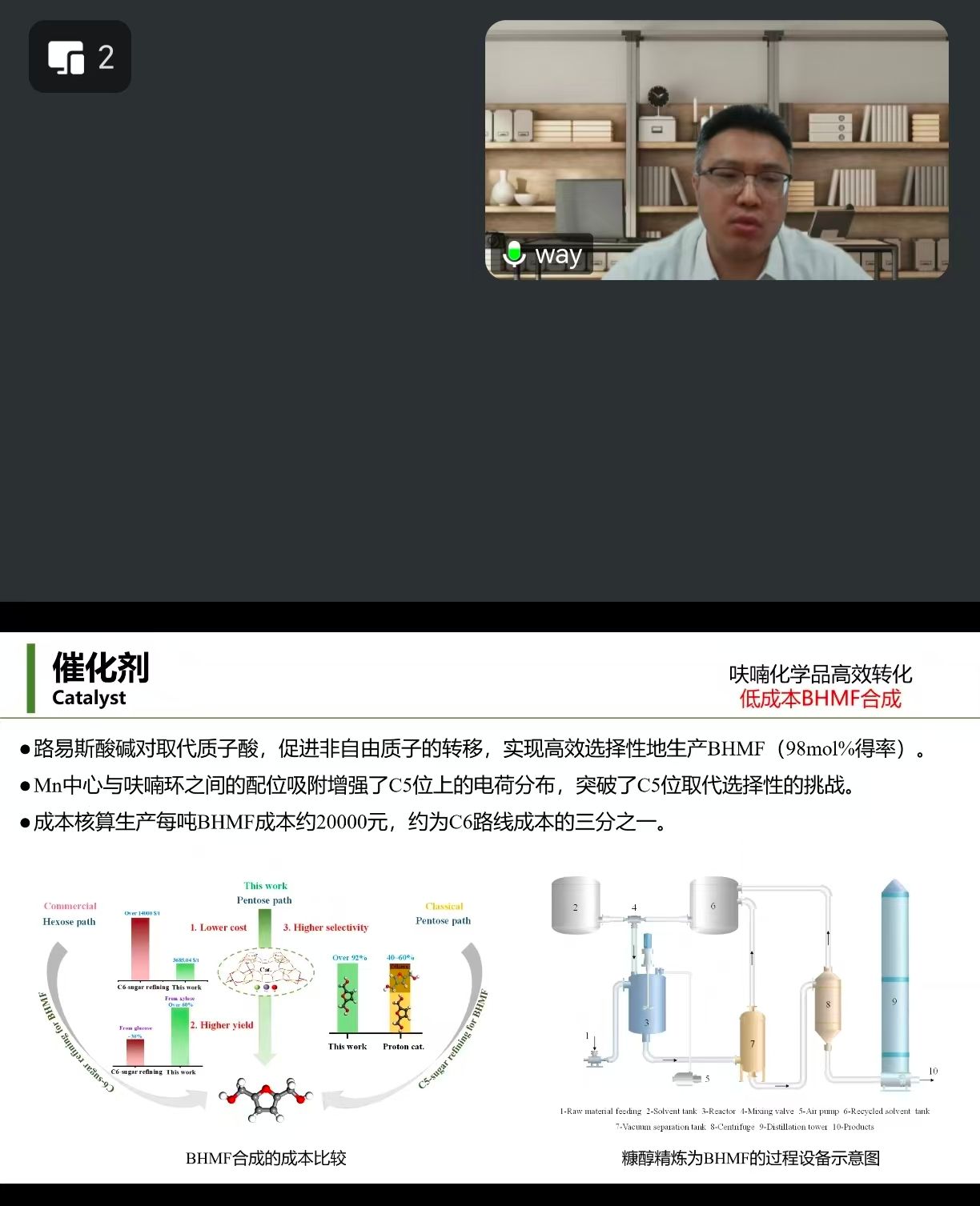 王奎研究員在生物基呋喃化學品低碳高效轉化領域的研究報告中先介紹了生物基呋喃化學品低碳高效轉化領域的相關技術背景,詳細介紹了陰離子效應對葡萄糖轉化為5-羥甲基糠醛(HMF)的調控機制,通過電子張力效應加速糖類定向轉化,為均相催化劑篩選提供理論依據(jù)。進一步,王奎研究員詳細介紹了其團隊在創(chuàng)制液態(tài)糧食(單糖、低聚糖)、呋喃基聚酯(PEF)、聚酰胺等功能材料的?高值化產(chǎn)品開發(fā)方面所開展的一些工作,推動了生物基材料在能源和化工領域的應用?。最后,王奎研究員談及了其課題組在?產(chǎn)業(yè)化與示范方面所開展的一些工作。王奎研究員的學術報告展示了他在呋喃基材料在功能化應用方面的研究進展,對大家今后研究方向的拓展有很好的啟發(fā)性。