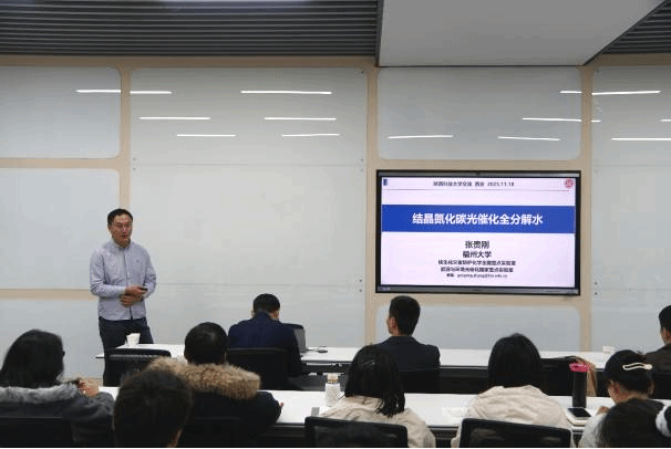 報(bào)告會(huì)上,張貴剛聚焦聚合物半導(dǎo)體光催化材料研發(fā)與應(yīng)用這一前沿領(lǐng)域,系統(tǒng)介紹了結(jié)晶氮化碳作為光催化全分解水制氫材料的獨(dú)特優(yōu)勢(shì)。他指出,氮化碳作為近年來(lái)快速發(fā)展的新型光催化劑,不僅具備可見(jiàn)光吸收能力,其導(dǎo)帶與價(jià)帶位置更完美契合光催化全分解水的熱力學(xué)要求,是實(shí)現(xiàn)一步激發(fā)制氫的理想材料,為太陽(yáng)能向氫能轉(zhuǎn)化提供了重要技術(shù)路徑。針對(duì)氮化碳熱聚合過(guò)程中存在的傳質(zhì)慢、脫氨難、聚合度低、結(jié)構(gòu)缺陷密度高等關(guān)鍵科學(xué)瓶頸,以及由此導(dǎo)致的光生電荷易復(fù)合、催化效率不足等問(wèn)題,張貴剛教授分享了團(tuán)隊(duì)的創(chuàng)新性研究成果。通過(guò)對(duì)氮化碳熱聚合過(guò)程進(jìn)行理性調(diào)控,創(chuàng)新性采用具有低共熔點(diǎn)的無(wú)機(jī)熔鹽作為反應(yīng)媒介,將傳統(tǒng)固態(tài)反應(yīng)介質(zhì)轉(zhuǎn)化為液態(tài)或半液態(tài)體系,顯著改善了熱聚合過(guò)程中的傳質(zhì)與擴(kuò)散效率,成功提升材料聚合度、降低缺陷態(tài)密度,為光生電荷快速轉(zhuǎn)移奠定了結(jié)構(gòu)基礎(chǔ)。報(bào)告兼具學(xué)術(shù)深度與實(shí)踐指導(dǎo)意義,不僅讓在場(chǎng)師生系統(tǒng)了解了光催化全分解水領(lǐng)域的研究熱點(diǎn)與發(fā)展趨勢(shì),更通過(guò) “靶向解決科學(xué)瓶頸-創(chuàng)新技術(shù)路徑-實(shí)現(xiàn)性能突破”的完整研究邏輯,為在場(chǎng)師生提供了寶貴啟示。