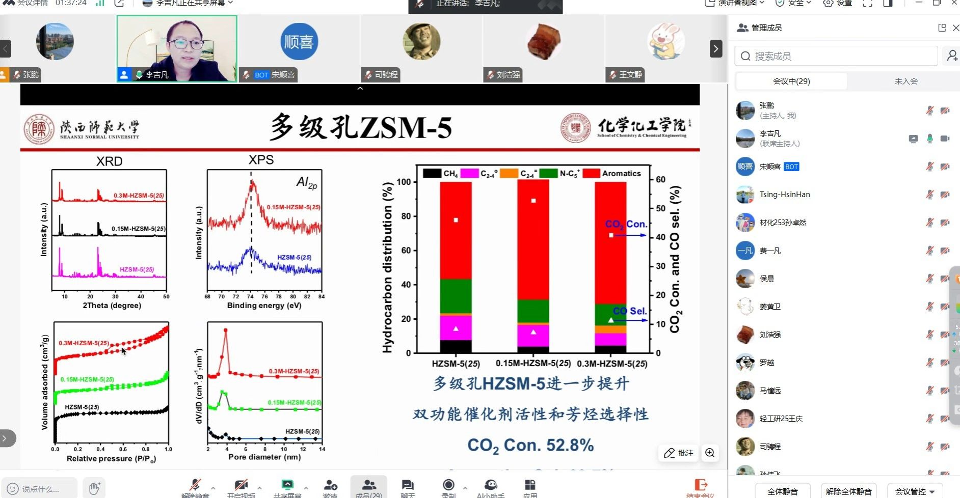 李吉凡系統(tǒng)闡述了非金屬基催化劑的設(shè)計思路與核心原理,深入剖析了限域策略、生物質(zhì)磷源引入策略等關(guān)鍵技術(shù)路徑在提升加氫催化活性方面的核心作用。他結(jié)合自身長期致力于多相催化與納米材料設(shè)計領(lǐng)域的研究背景,尤其是在分子篩膜包覆相關(guān)催化體系及二氧化碳加氫轉(zhuǎn)化等方向的研究積累,詳細介紹了如何通過精準調(diào)控催化劑的孔道結(jié)構(gòu)、表面電子態(tài),實現(xiàn)限域環(huán)境的構(gòu)建與生物質(zhì)源的高效引入,進而動態(tài)優(yōu)化加氫反應(yīng)的活性位點與反應(yīng)路徑。他特別介紹了陜西師范大學(xué)在催化材料制備與性能研究方面的科研平臺支撐能力,展示了上述設(shè)計思路與策略在提升加氫反應(yīng)效率、降低反應(yīng)能耗等方面的應(yīng)用潛力,將深奧的催化理論與綠色化工的前沿應(yīng)用緊密結(jié)合,拓寬了聽眾的學(xué)術(shù)視野,對今后在非金屬基催化材料設(shè)計與加氫反應(yīng)優(yōu)化領(lǐng)域的研究工作具有重要的指導(dǎo)意義。